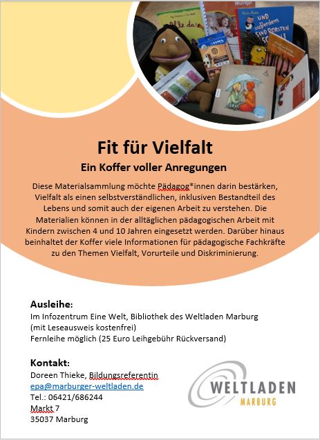Zielgruppe: Kinder zwischen 4-10 Jahren, pädagogische Fachkräfte Das Schul- und Bildungsprojekt êpa! des Weltladen Marburg hat den Materialkoffer Fit für Vielfalt entwickelt, der viele Informationen für pädagogische Fachkräfte zu den Themen Vielfalt, Vorurteile und Diskriminierung bereithält. Die Materialien können in der alltäglichen pädagogischen Arbeit mit Kindern zwischen 4 und 10 Jahren eingesetzt werden.